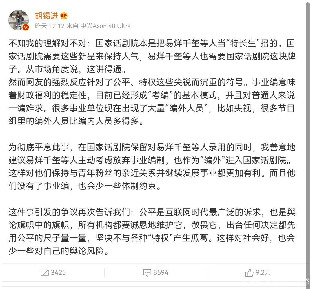 胡老師昨天的“進言”,幾乎是一個長者對年輕人“掏心掏肺”的最大幫助。相信易烊千璽團隊也是看到了“長者如師”的胡老師博文,才迅速有了今天的“辭職心聲與決定”。