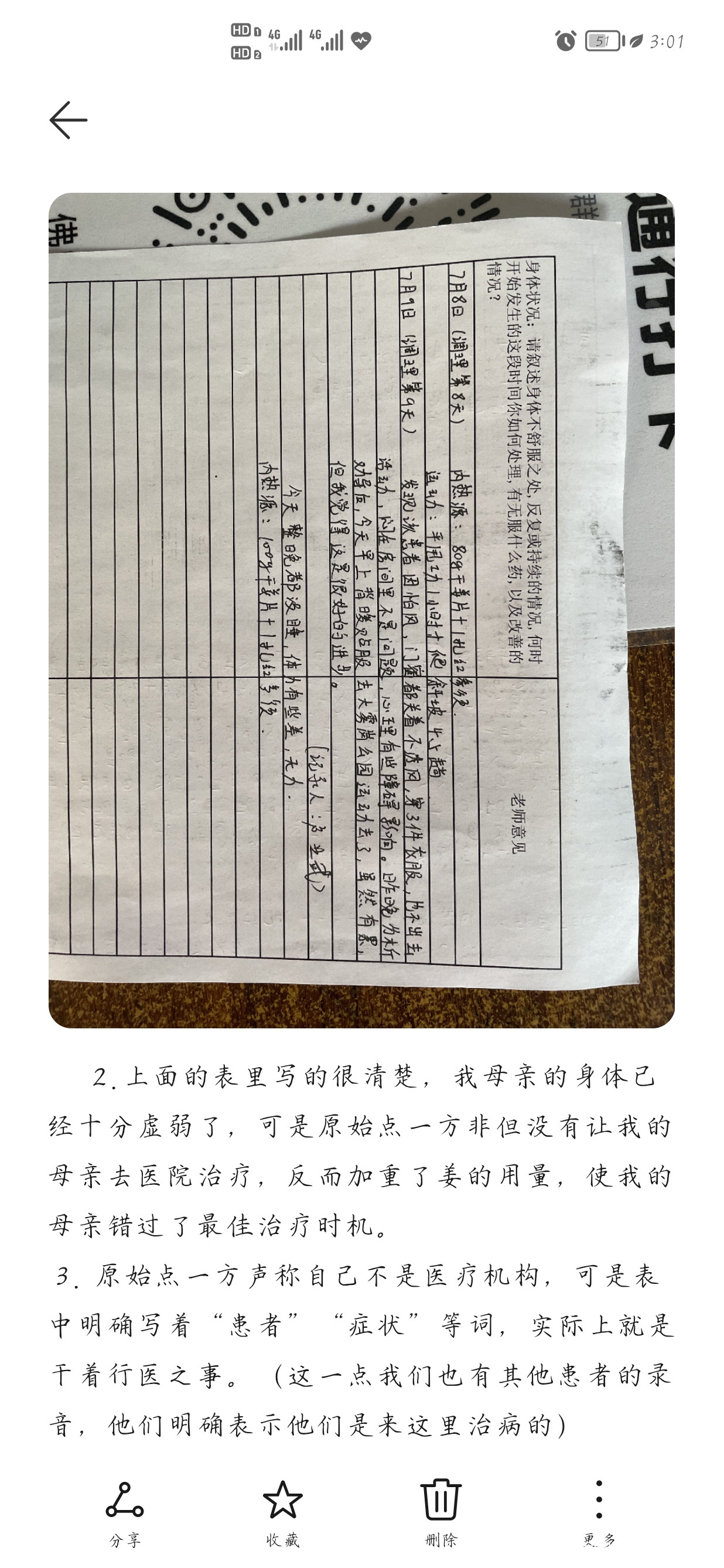 而他們向患者提供的醫療書籍、姜膏、姜粉、姜參丸全是非法出版和三無產品,用錯誤的方法讓我的母親延誤了最佳治療時機,慘死在出租屋內。