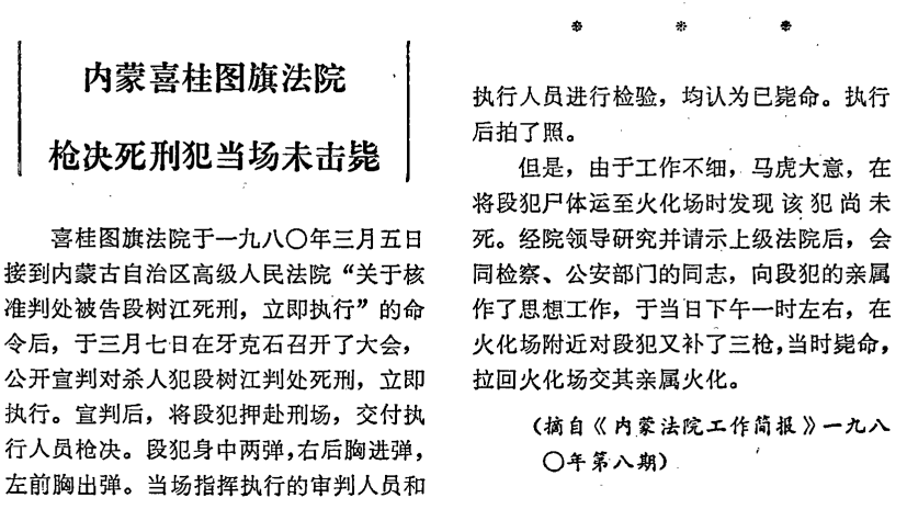 像這種送到火葬場才發現人沒死的不止這一例。早在1980年的內蒙古就有一個叫段樹江的殺人犯被判處死刑立即執行後,在刑場身後兩彈都沒死,這兩顆子彈從段樹江的右後胸進、左前胸出,直接打穿了胸部兩槍,當時在場的法警和檢察都已經確定段樹江已經死亡,甚至還拍了照作為檔案留存。