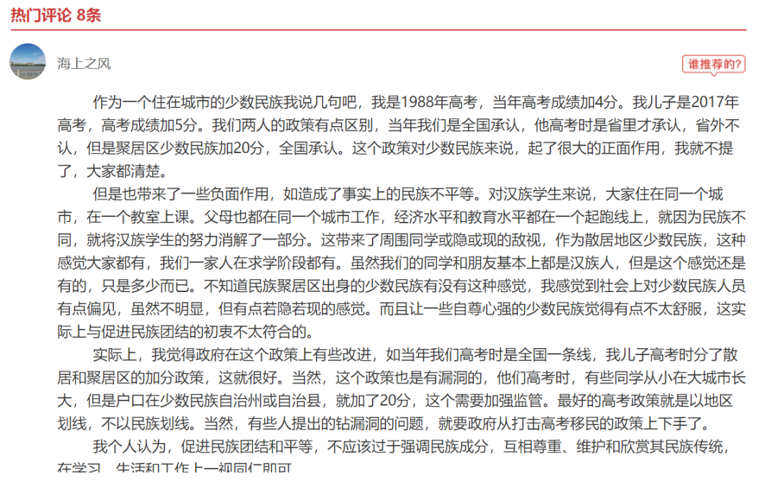 在《取消少數民族加分,作為少數民族的我怎麼看?》的風聞社區評論區,讀者“海上之風”一個留言引起了我的注意。今日,專門發佈,歡迎大家討論。