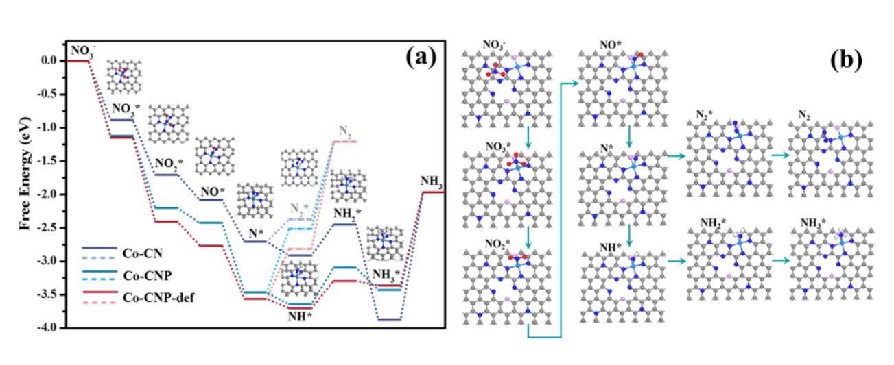 研究團隊根據密度泛函理論計算,創新強化污染物淨化的單原子尺度結構調控理論與方法,從分子水平上對硝酸根在模型單原子鈷催化劑活性位點的轉化反應機理進行了探究,分析反應路徑和能量變化。結果表明,硝酸根在單原子位點上逐步發生脱氧加氫的基元反應,N*物種可以在外部提供能量時進一步偶聯形成氮氣,也可以自發與氫逐步反應形成銨鹽。磷摻雜後形成的缺陷位點可以促進臨近CoP1N3位點對硝酸鹽的催化轉化,硝酸鹽還原過程發生8電子數轉移生成銨鹽。此外,研究還發現,金屬活性位點臨近的缺陷結構有助於進一步提高單原子催化劑活性,在理論上為設計高活性位點的催化劑提供指導並揭示硝酸反應轉化和產物分佈規律。