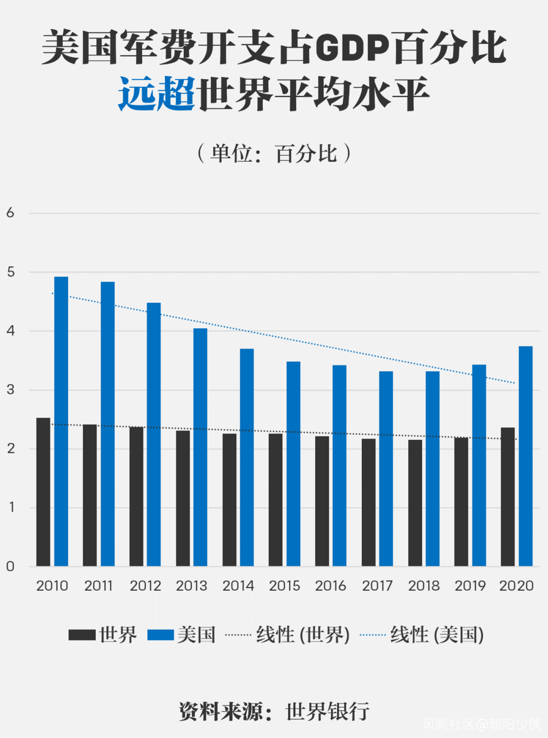 ▲美國軍費開支佔GDP百分比遠超世界平均水平。(資料來源 | 世界銀行)