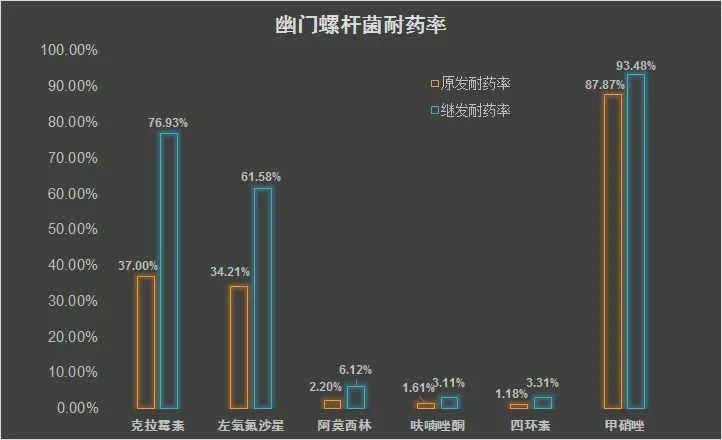 同時,隨着抗生素在Hp根除治療中的大範圍使用,Hp耐藥率不斷升高。中國幽門螺桿菌分子醫學中心耐藥監測數據顯示,我國克拉黴素、左氧氟沙星、甲硝唑的耐藥率已經處於較高水平。日益嚴重的Hp耐藥性,讓本就可能失敗的經驗治療,面臨更加嚴峻的挑戰。