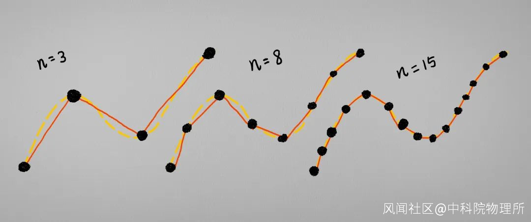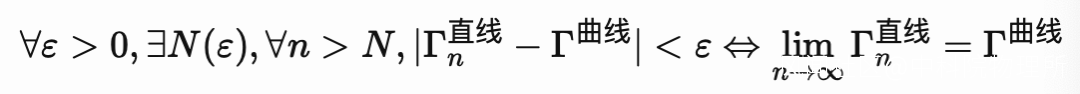 那麼面對這樣的槓精, 我們能做的只有——進一步地增加特徵點的數量, 比如説當特徵點數量n≥N(ε)時, 我們的誤差就會小於ε. 於是我們便可以自豪地邪魅一笑: 直線也能夠逼近曲線. 用數學的語言來説便是: