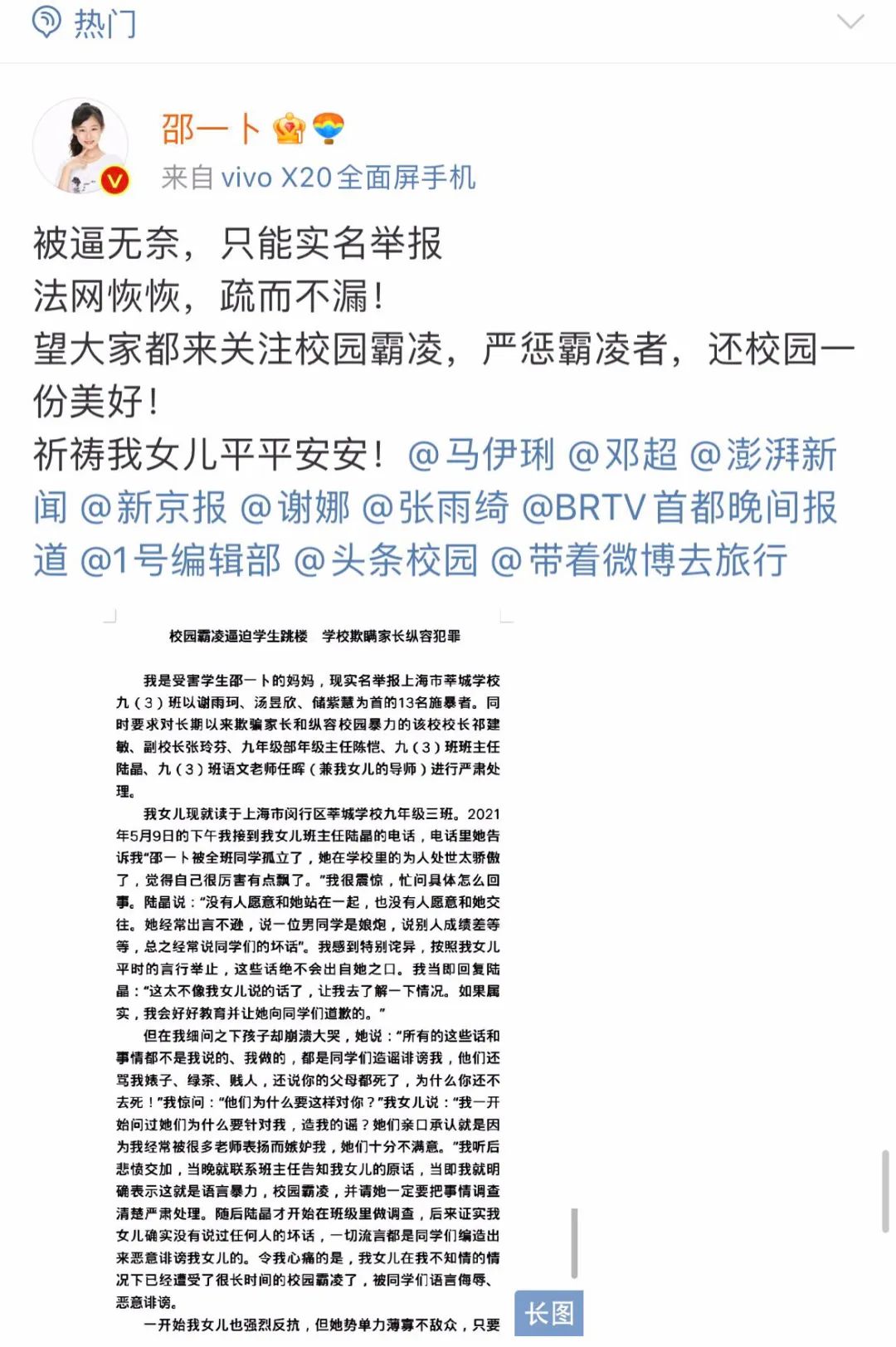 迫於無奈,6月17日,尤永梅通過邵一卜的微博發佈長文,實名舉報班級裏曾欺凌過邵一卜的學生以及學校的相關老師,希望能夠追究他們的法律責任。