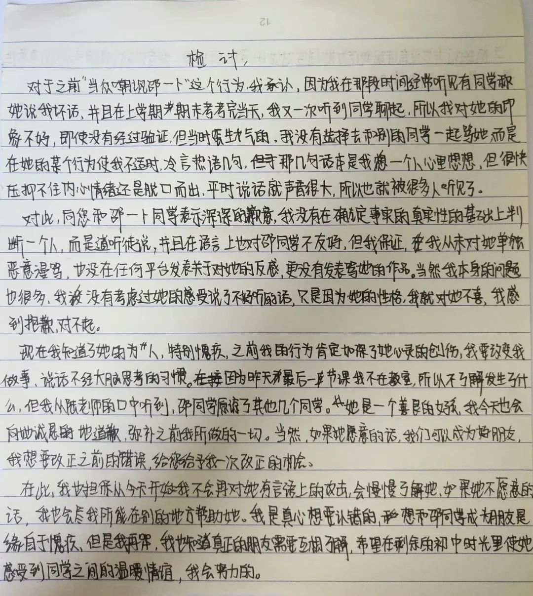 最終,在經過老師調查後,證實了邵一卜從未以言語攻擊過他人,而那些攻擊過邵一卜的同學,也有人寫下道歉信交到了尤永梅的手中。