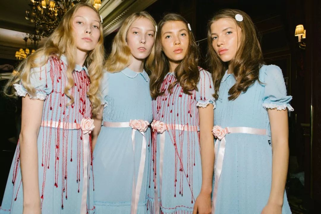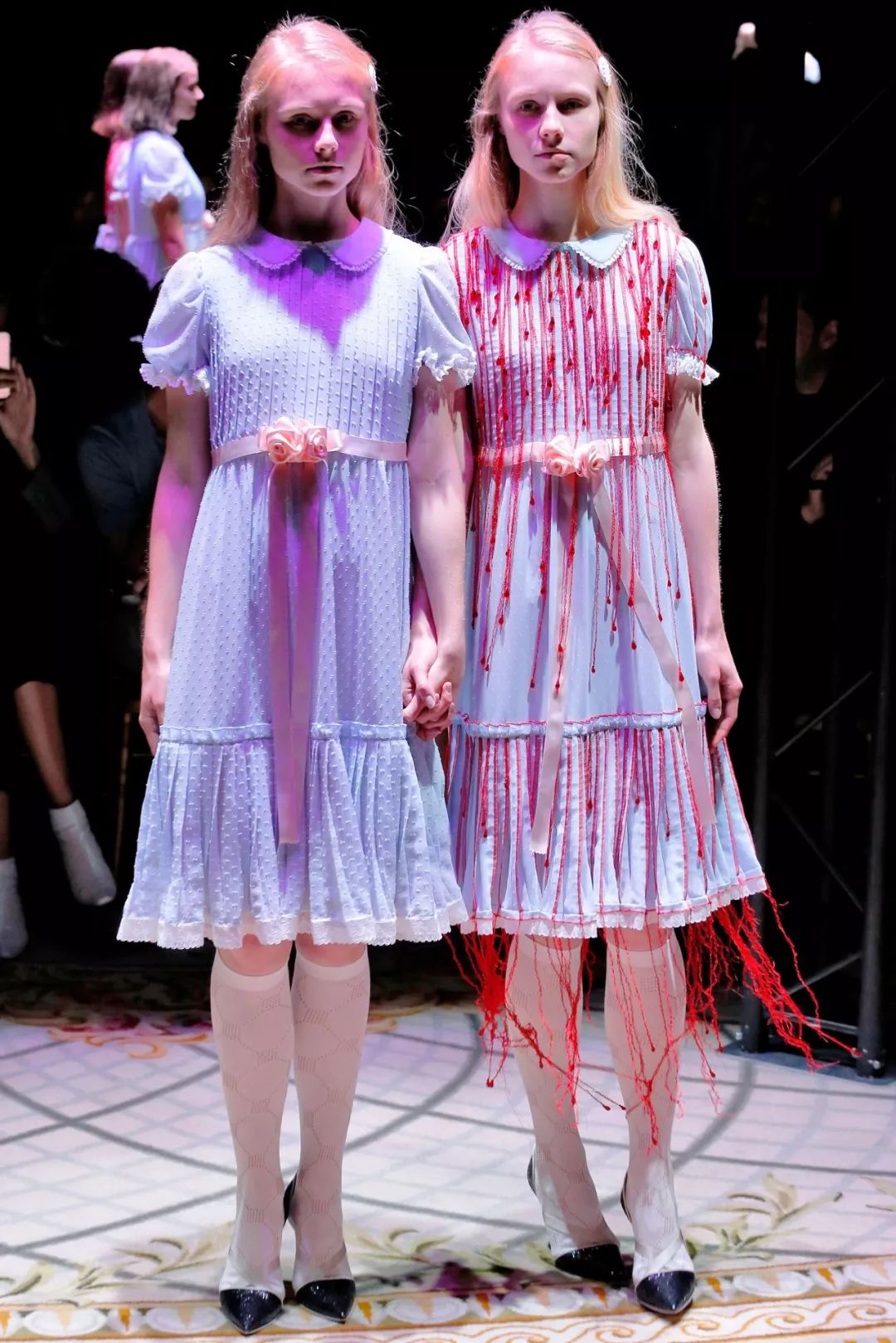 高橋盾重現了雙姝的粉藍色長裙,用紅色珠鏈詮釋雙胞胎身上的血跡,更讓所有模特化身雙生姊妹,在詭異的燈光中,兩兩結伴,魚貫而出。
