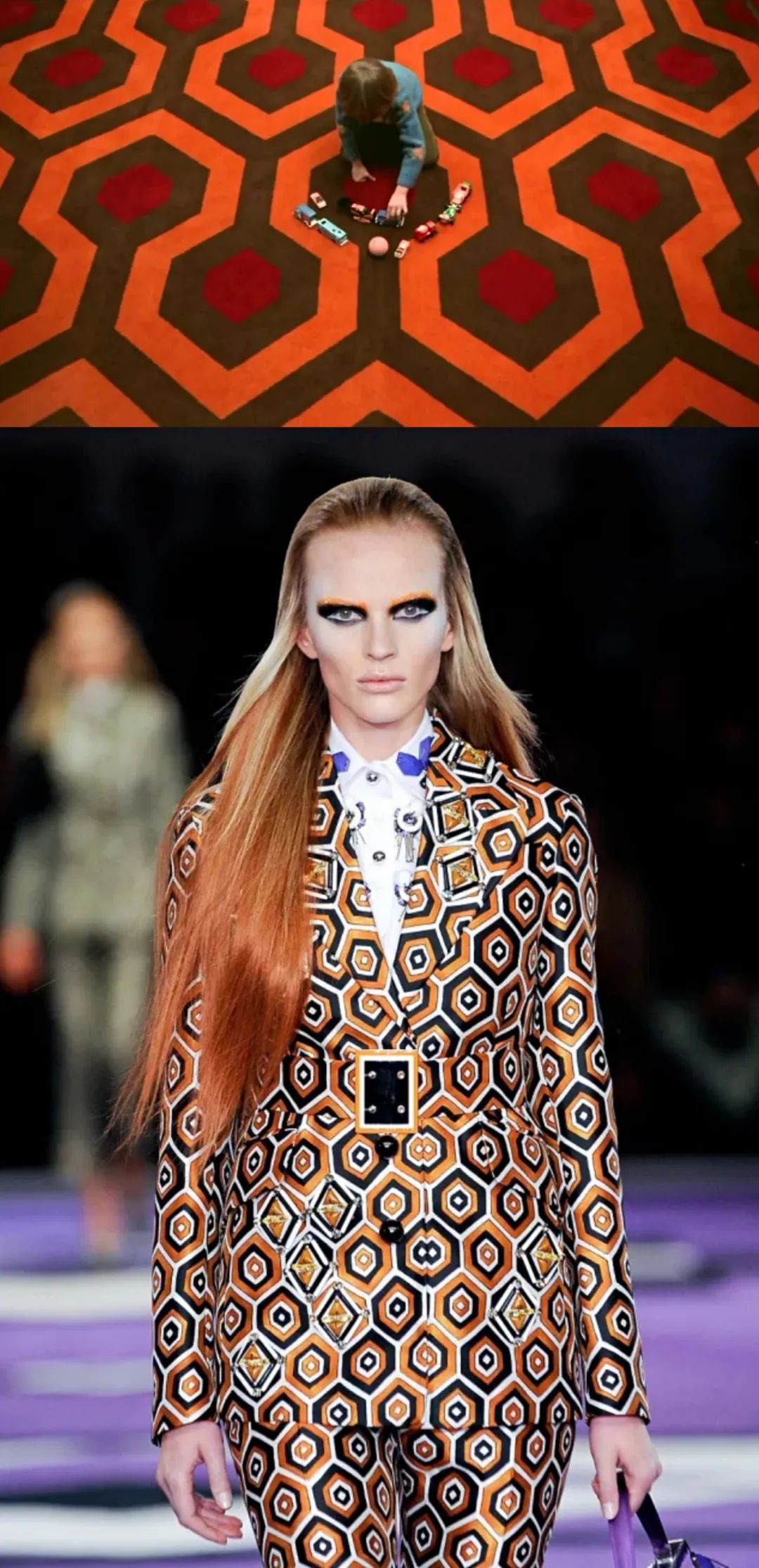 貫穿整個 Prada 2012 秋冬系列的六邊形紋樣,也讓人回想起《閃靈》之中走廊地毯:極具視覺衝擊力,帶着迷幻的空間感,如同一座無限延伸的恐怖迷宮。