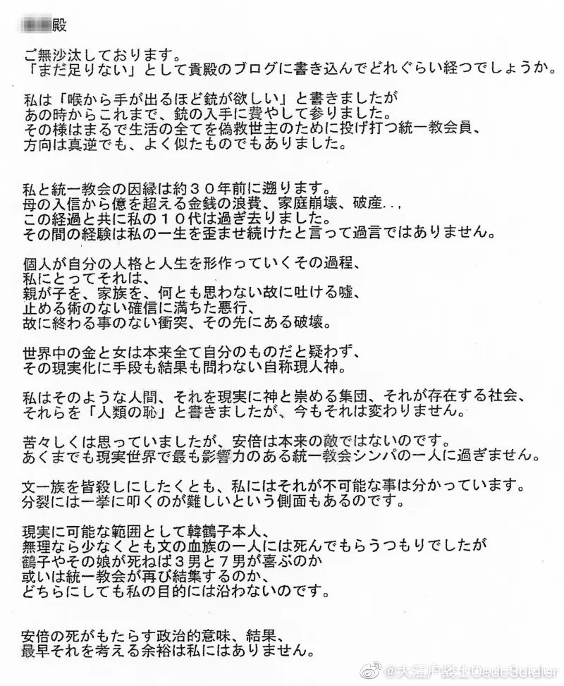 山上徹也在事件前一天給某人寄的信寫明瞭自己的經歷以及暗殺安倍的理由,信件全文: