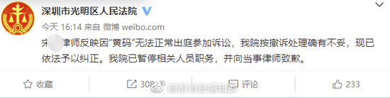 深圳市光明區人民法院官方微博7月17日發文稱,“宋律師反映因“黃碼”無法正常出庭參加訴訟,我院按撤訴處理確有不妥,現已依法予以糾正。我院已暫停相關人員職務,並向當事律師致歉。”