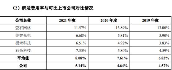 報告期內,創米科技的研發費用分別為3993.70萬、5215.02萬以及7880.76萬元,佔營業收入的比例分別為4.57%、4.64%以及5.14%,研發費用率雖在持續提升,但仍大幅低於同行業可比公司均值,可比上市公司平均值分別為6.83%、7.61%以及8.08%。