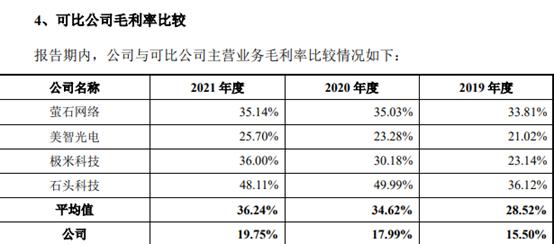 2019年至2021年,**創米科技的毛利率分別為15.50%、17.99%以及19.75%;而行業內近三年毛利率平均值分別為28.52%、34.62%和36.24%。**創米科技毛利率明顯偏低。