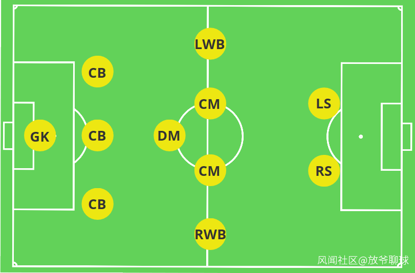 有了3名中後衞作為兜底,兩名邊翼衞在進攻狀態下不用過於擔心邊路防守,可以放心前插到對方的防守三區,和前場本就存在的三名前鋒形成邊中結合。兩名邊翼衞的存在不一定意味着一定要拿球沿邊路發動進攻,有時通過無球跑動牽扯對方的防守注意力也是一個不錯的選擇。