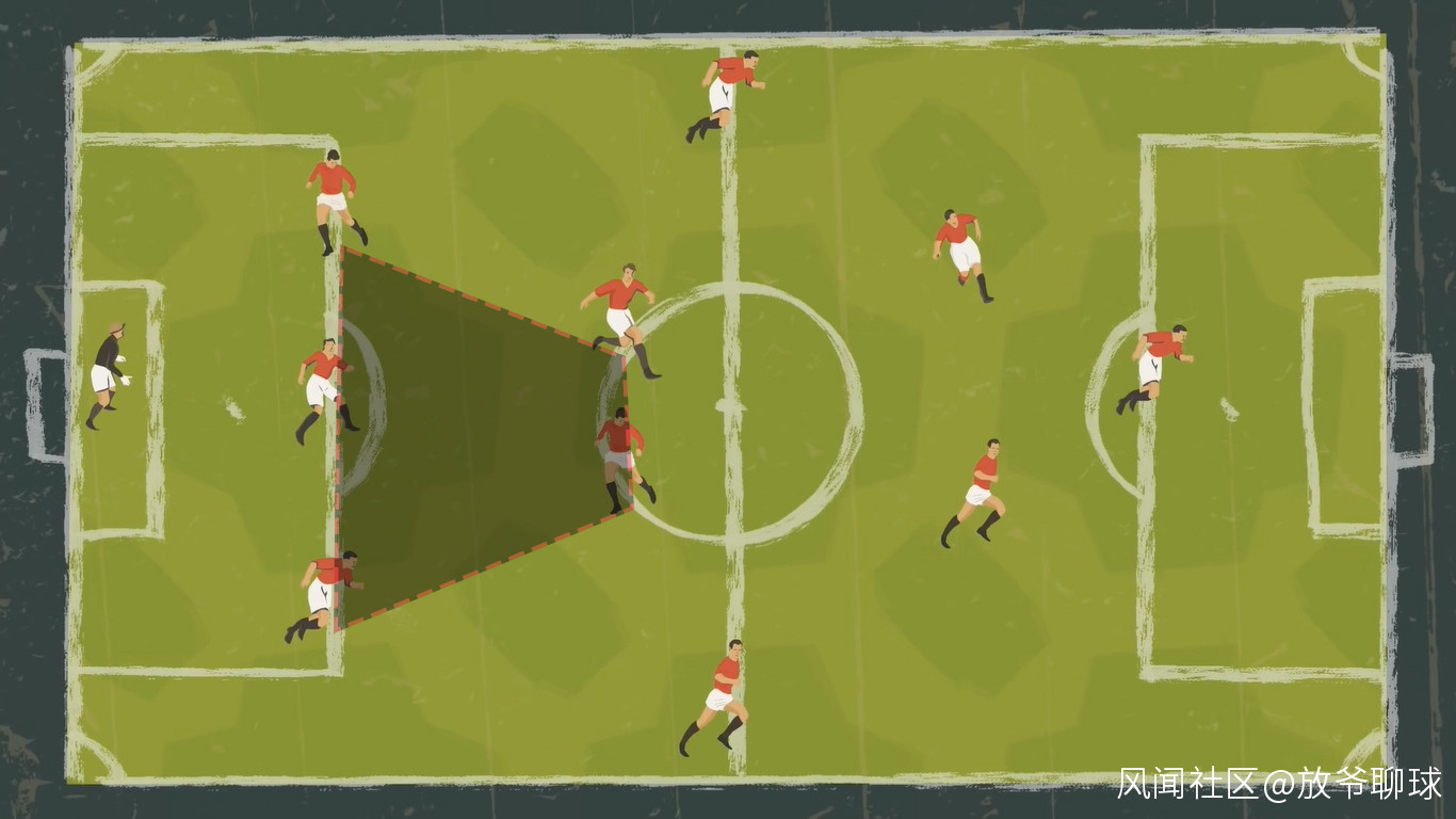 除此之外,邊翼衞為進攻帶來的另外一大特點便是能夠和邊鋒在邊路形成以多打少的局面。如上圖所示,由於邊翼衞在進攻中的高度前插,配合己方已經存在的邊鋒,就能夠對對方的邊路防守球員形成以多打少的局面。而此時,兩名居中中場其中之一可以將位置適度前提,就可以接應邊路球員的倒三角回傳,主教練苦苦所追求的邊中結合就此達成。