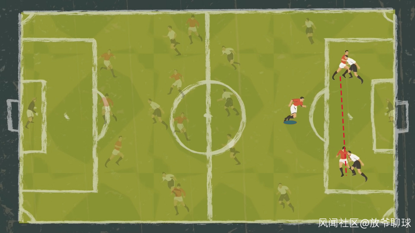 如上圖所示,邊翼衞一旦插入了對方的防守腹地,必然會迫使對方派出2~3人的邊路防守羣體限制其進一步前插。在此背景下,相對靠近中路的三名前鋒所受到的防守壓力就會降低,邊翼衞就此通過無球跑動為中路的接應隊友創造出更多的拿球空間,無論是外圍直接遠射還是更加精妙的中路小範圍配合都是不錯的選擇。
