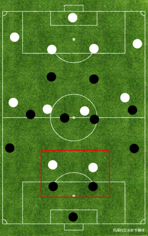 邊翼衞位置的大幅度壓上看似會給予防守不穩定的因素,但從另外一個角度來説,也能讓前場的高位逼搶能夠組織得更加從容。當球權轉移,邊翼衞無需第一時間高速回撤參與防守,這樣只會讓對方在第一階段的出球處理更加從容。如若配合前場已經存在的3~4名球員加以逼搶,如此之多的防守人數可以有效遏制對方在初級階段的進攻嘗試,甚至在不少時候就地斷下皮球發動反擊。