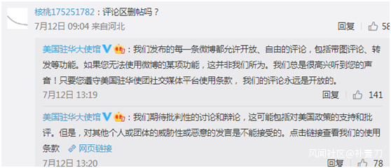 美國大使館微博也曾以回覆留言的方式稱,只要遵守使用條款,它們的評論區“永遠是開放的”。