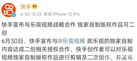 到了6月,快手也宣佈與樂視視頻的獨家自制內容達成二創相關授權合作。