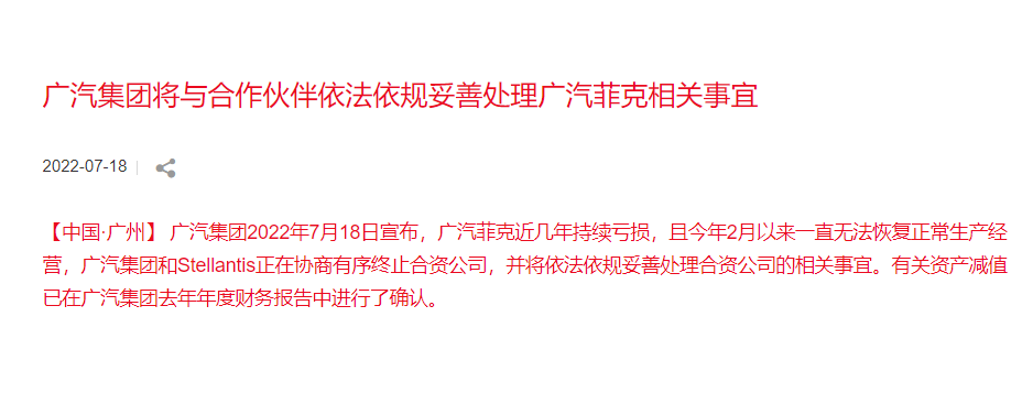 當地時間2022年7月18日,Stellantis集團在阿姆斯特丹對外發布消息稱:該集團擬與廣汽集團有序終止成立於 2010 年 3 月的合資企業,也就是大家所熟知的廣汽菲克。