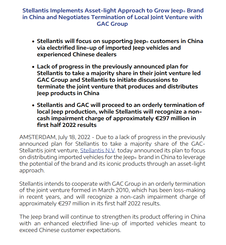據Stellantis集團的表述,此前宣佈的Stellantis 收購其合資企業多數股權的計劃缺乏進展,導致廣汽集團和 Stellantis 開始討論終止在中國生產和分銷 Jeep品牌產品的合資企業-廣汽菲克。