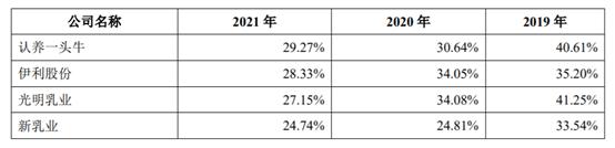細看認養一頭牛的毛利率,2019-2021年,主營業務毛利率分別為 40.95%、30.79%和28.86%,將2019年運費合併至主營業務成本後,各期主營業務毛利率分別為29.05%、30.79%和28.86%。