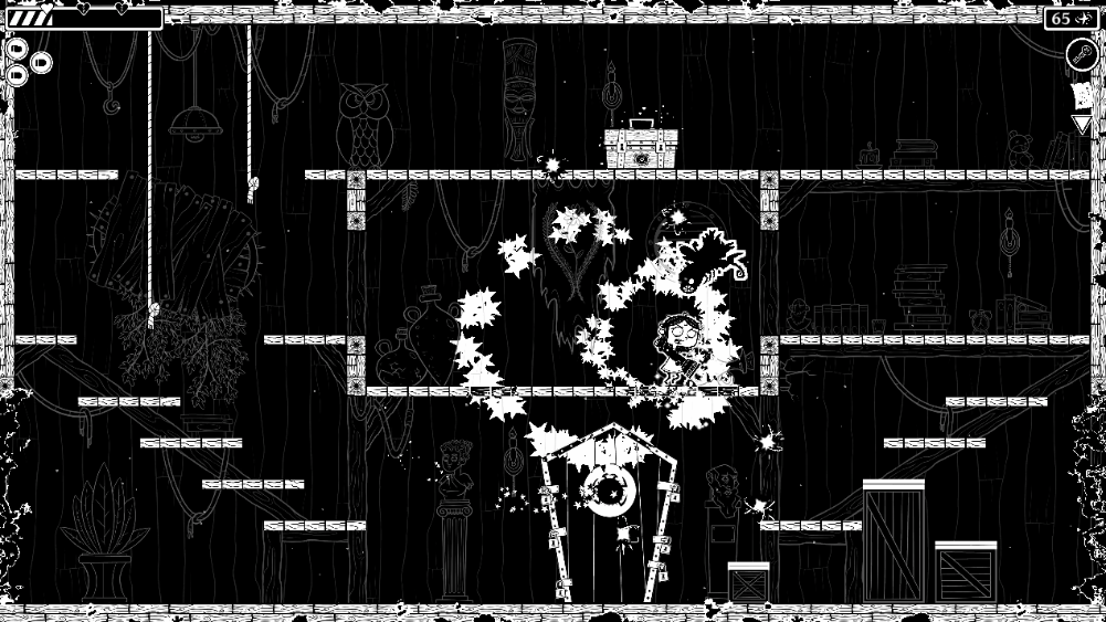 因為有平台跳躍的元素在,剩下的小裝置裝備則是圍繞着主角的移動來設計的,功能各異的各種鞋子可以提供二段跳、空中懸停、緩慢降落等功能。