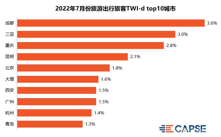 此前,根據CAPSE發佈的《2022年7月旅客出行意願指數分析報告》顯示:2022暑期旅遊高峯期集中在七月中下旬,八月上旬,成都是旅遊出行旅客首選目的地,三亞是旅遊旅客出行主要目的地,其次為重慶、昆明、北京、大理、西安、廣州、杭州和青島。