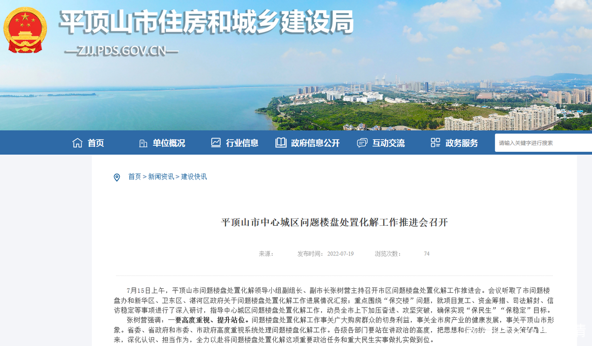 同日,河南省平頂山市住房和城鄉建設局發佈的“平頂山中心城區問題樓盤處置化解工作推進會”相關內容,7月15日上午,平頂山市問題樓盤處置化解領導小組副組長、副市長張樹營主持召開市區問題樓盤處置化解工作推進會。