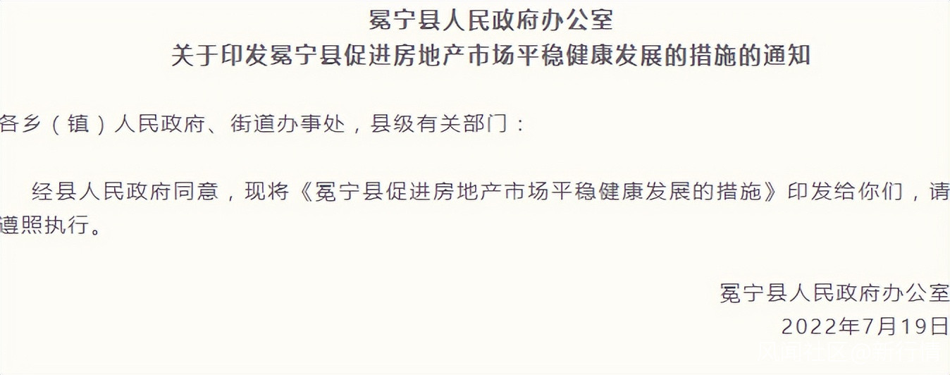 7月19日,四川省涼山彝族自治州冕寧縣發佈的《冕寧縣人民政府辦公室關於印發冕寧縣促進房地產市場平穩健康發展的措施的通知》中亦提到,加快協調處置房地產開發項目遺留問題(針對問題樓盤)。