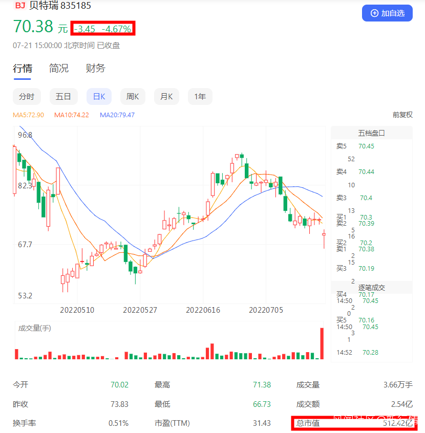 截至7月20日收盤,貝特瑞股價報73.83元/股,總市值為537.5億元。在貝特瑞之後,北交所僅有吉林碳谷、連城數控兩股總市值在100億元以上,分別為202.9億元、150.3億元。從總市值上來看,貝特瑞遠遠高於其他個股。