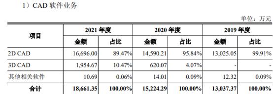 據悉,浩辰CAD軟件業務收入主要包括2DCAD收入、3DCAD收入和其他相關軟件收入,其中2DCAD收入佔CAD軟件業務收入的比重分別為99.91%、95.84%和89.47%,為CAD軟件業務的主要構成部分。