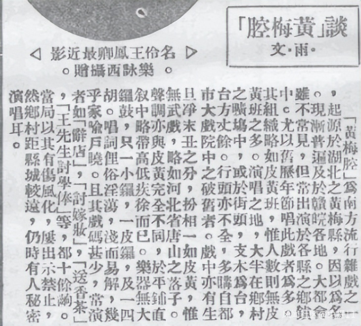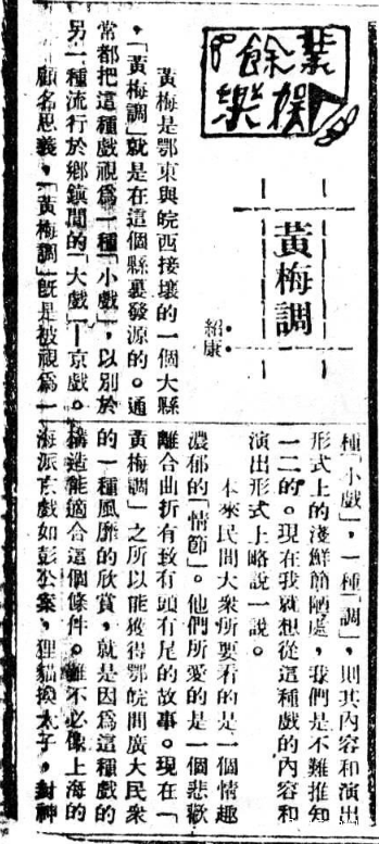 這是《北洋畫報》1935年第324期“戲劇專刊”上的一篇文章,名字是《談“黃梅腔”》。我們來看看此文的第一句吧。“‘黃梅腔’為南方流行雜戲之一,起源於湖北之黃梅縣,因以為名。”