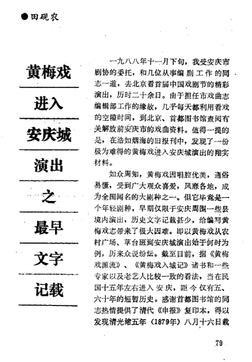 那麼這張報紙是最近才被發現的嗎?當然不是。早在1988年11月,這張報紙就已經被發現了,發現這張報紙的人是安徽省安慶市戲研室的田硯農,並且他將這個發現發表在《黃梅戲藝術》1989年第3期上。見下圖。