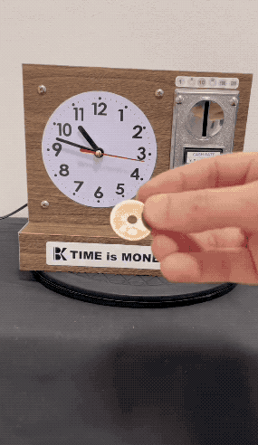 購買方式也很簡單,通過日本老哥自己發明的**“ 時間就是金錢 ” ATM 機**,在時鐘旁邊,有一個投幣口,只要每次往裏投入硬幣,時鐘上的秒針就會飛速回轉相應的金額,成功實現 “ 時光倒流 ”。