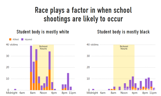 圖中可以看到種族問題也可能是校園槍擊案的其中一個因素。橙色為死亡人數,紫色為受傷人數。白人學生多(左),黑人學生多(右)。