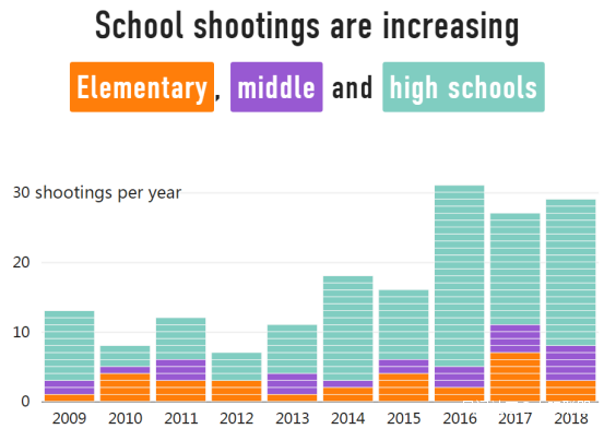 圖中為2009至2018年小學、初中和高中槍擊案數量。橙色為小學,紫色為初中,綠色為高中。