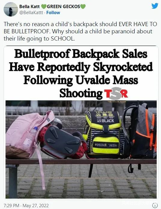 德克薩斯州烏瓦爾迪的羅布校園槍擊案後,**防彈衣以及防彈書包的銷售量飆升200%至300%。**學生家長對槍擊案件的恐慌尤其強烈,馬上臨近新學期開學,意味着孩子們又要重返校園。