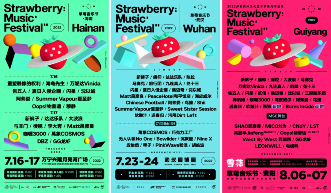因上半年疫情致演出受阻, 到目前為止,全國各地七八月待演和官宣的音樂節多達40場,包括海南、武漢、貴陽、成都等多地的草莓音樂節,成都仙人掌音樂節,楠溪江星巢秘境音樂節,常州西太湖國際音樂節等。
