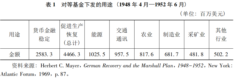 憑藉對等基金制度,美國的美元援助又對應了一筆受援國的本幣資金,由此將美國所能控制的對外援助資金價值翻了一倍。這種制度安排,一方面有助於促進受援國的生產恢復,美國的援助首先主要用於受援國消費,而對等基金的資金則主要作為投資資本用於促進恢復生產;另一方面受援國在不增加貨幣供應的情況下,同一筆資金先用於消費,後又用於投資,既有效擴大了投資規模,又可以減少貨幣供應,控制通貨膨脹水平。數據顯示,對等基金資金除用於促進受援國生產恢復之外,主要被用於推動各國的貨幣金融穩定。特別典型的是,作為西歐金融體系中心國家的英國,從對等基金中只提取了220萬美元用於生產恢復,而用於穩定貨幣金融體系的資金高達17.06億美元。