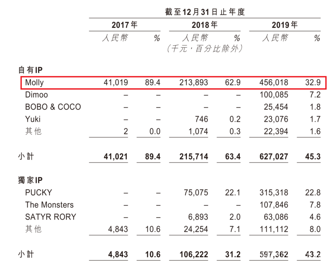 2017-2019 年,molly 分別貢獻了幾乎所有的收入,62.9% 的收入,32.9% 的收入。