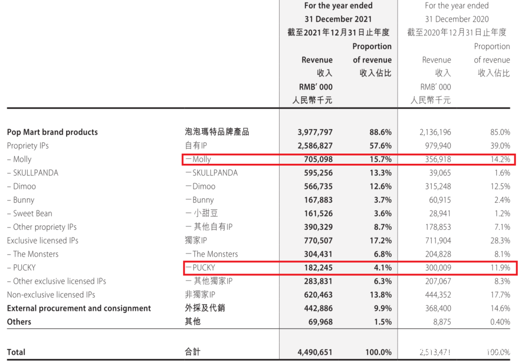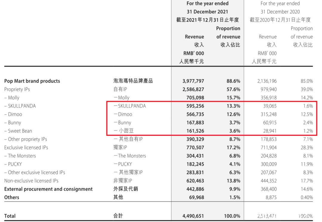 在 2021 年的財報中,自有 IP 下出現了小甜豆、SKULLPANDA、Dimoo、Bunny 這些新面孔,但它們貢獻的營收並不高。