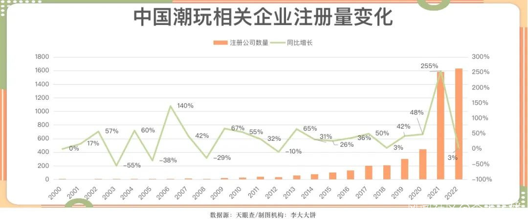 本編輯部拉取了天眼查中中國潮玩相關企業註冊量的數據,制了一張表,你可以看到,泡泡瑪特上市之後,潮玩相關企業的註冊量同比暴漲了 255% 。