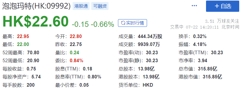 這家銷售潮流玩具的公司,股價已經從 2020 年年底上市後最高的 106 港元跌到 22 港元,足足跌去: