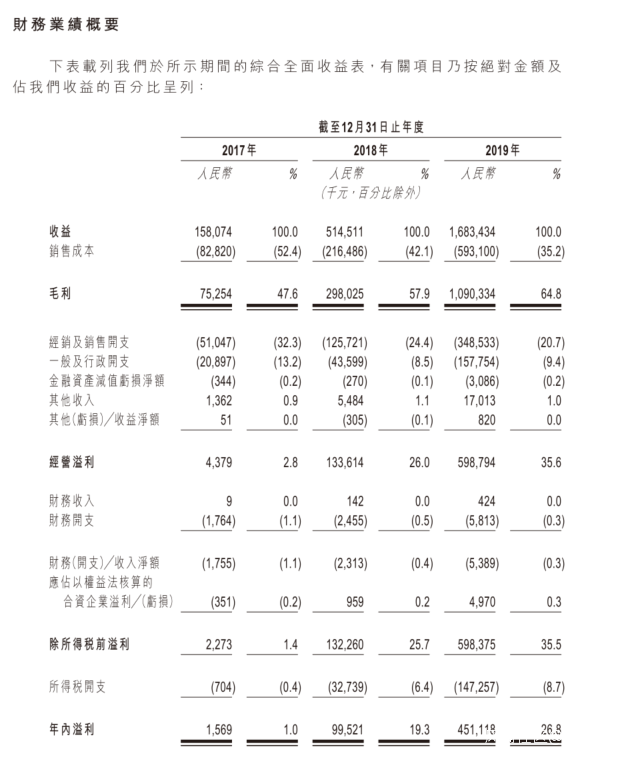 毛利率方面,2017 年是 47.6%,2018 年提高到 57.9%,2019 年提高到了 64.8% 。