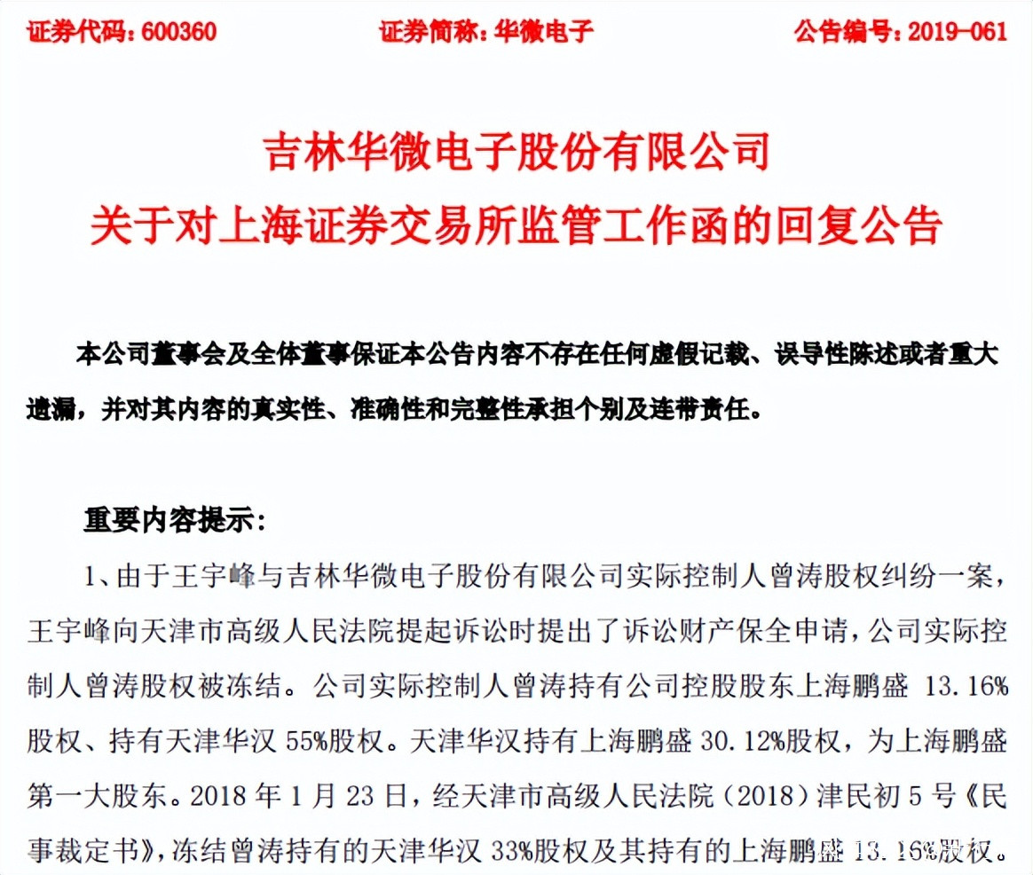 2020年8月,在華微電子首次就股權糾紛回覆問詢函中提到,上海鵬盛現股東受讓股權資金為自有及自籌資金,上海鵬盛股東曾濤不存在替公司董事長夏增文代持股份情況,公司控股股東為上海鵬盛,實際控制人為曾濤。