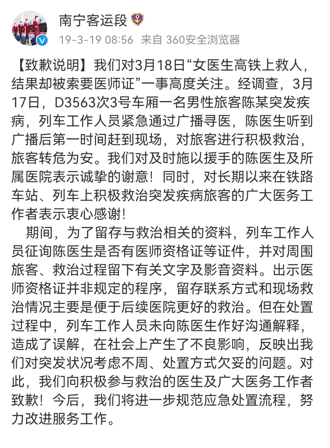 隨後,南寧鐵路局公開回應,列車工作人員徵詢陳醫生是否有醫師資格證等證件,並對周圍旅客、救治過程留下有關文字及影音資料。出示醫師資格證並非規定的程序,處置方式亦存在溝通欠妥的問題。對此,向積極參與救治的醫生及廣大醫務工作者致歉。今後,將進一步規範應急處置流程,努力改進服務工作。