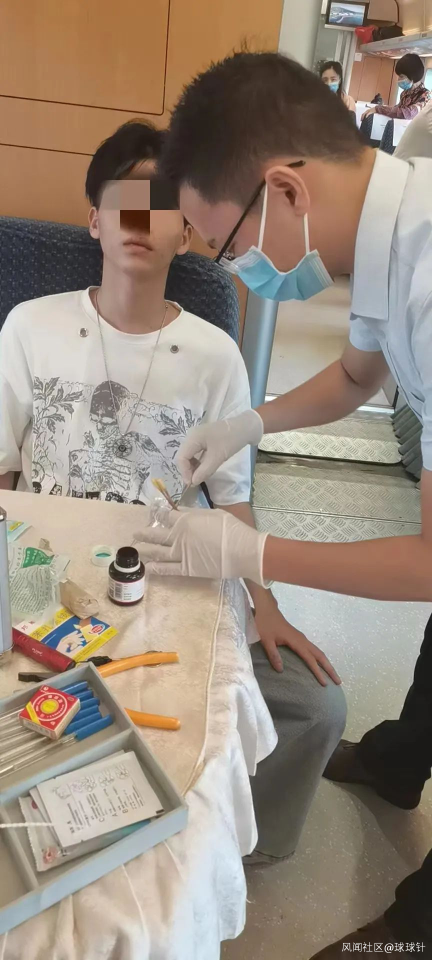 在其乘坐的D3714列車上,一旅客被掉落的行李箱砸中頭面部,血流不止。在乘務員的求助下,林醫生主動站出來幫助傷者清創,處理傷口。