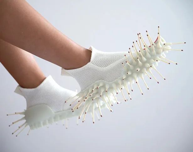 以色利設計師Netha Goldberg 用衞生棉條、火柴和USB充電插頭做成的針織鞋,之所以設計這樣的款式,是為了讓穿着者在旅途中能給別人提供幫助。