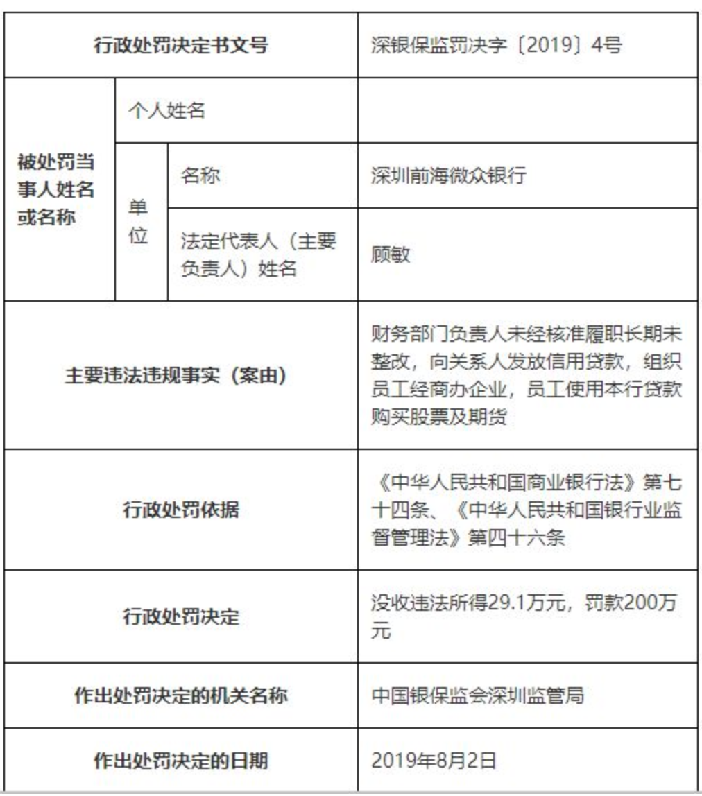另外,微眾銀行也曾在2019年因“向關係人發放信用貸款;組織員工經商辦企業;員工使用本行貸款購買股票及期貨;財務部門負責人未經核准履職長期未整改”而被深圳銀保監局罰款沒收違法所得29.1萬元,罰款200萬元,合計罰沒229.1萬元。