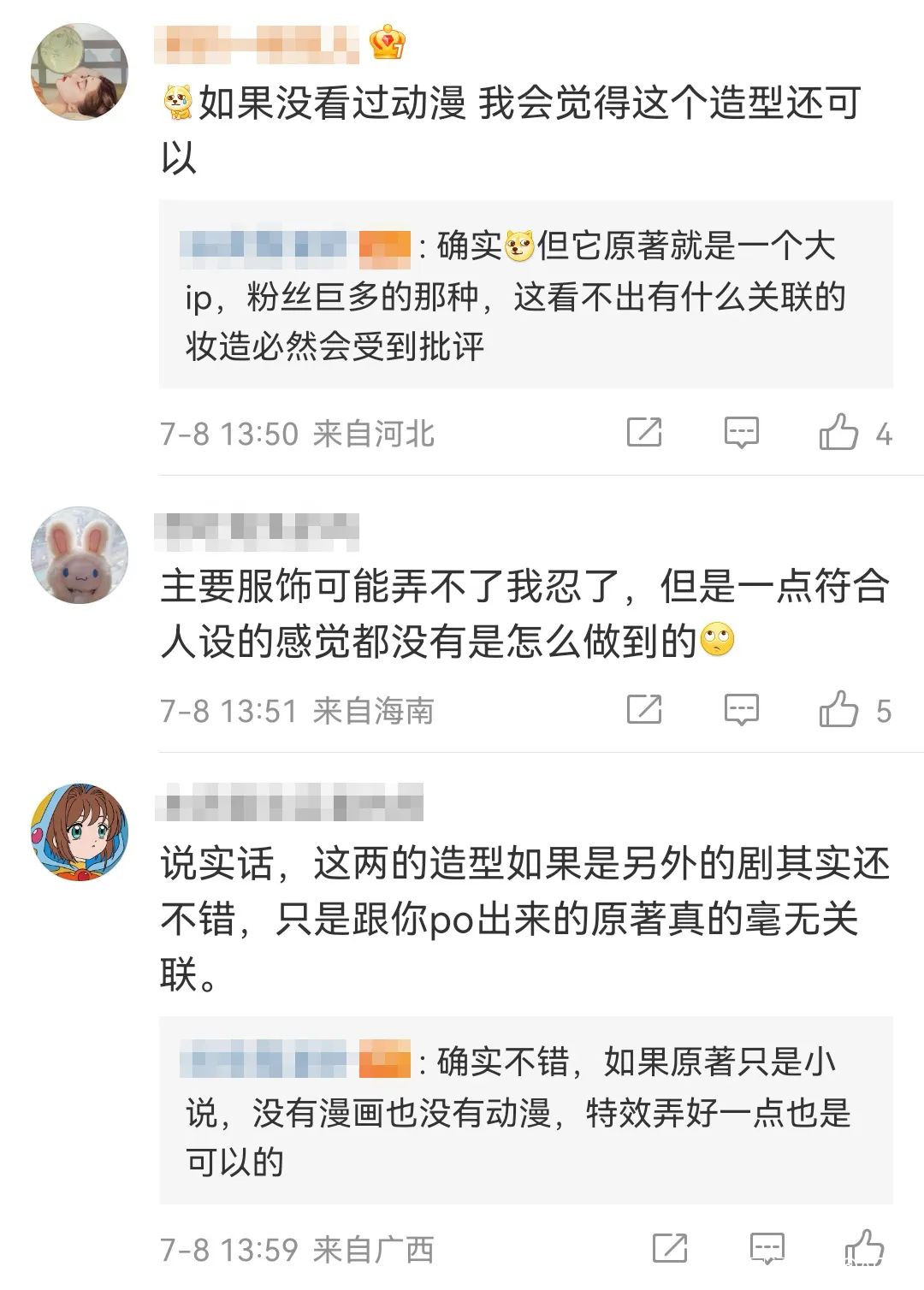 動漫作品會將故事角色具象化,在粉絲看來,角色相關的所有細節都有其存在的意義,當故事和人物通過其他載體呈現,其轉化過程難免要損失許多細節。比如作者在問答中,便提到了漫畫扉頁手辦化時遇到的難題,扉頁只需考慮構圖,但實體化成手辦後結構需要大幅調整。平面到手辦尚且如此,更不用説與二次元形象相隔“次元壁”的改編劇集造型了。